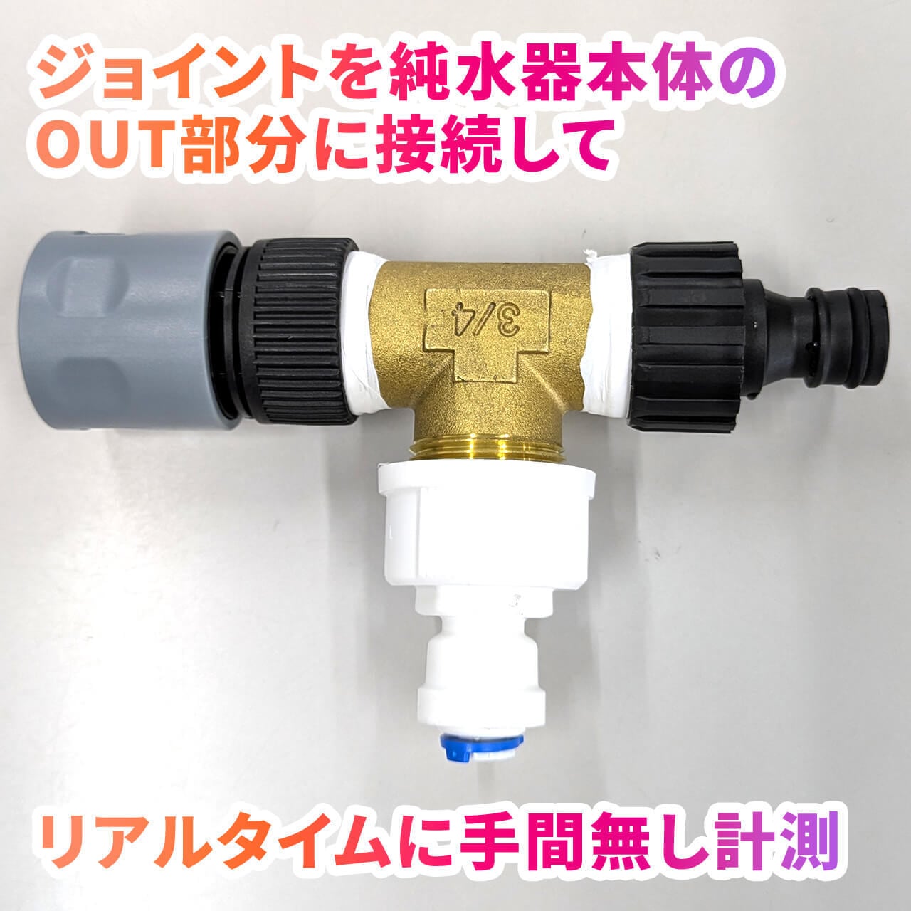 純水器のOUT側、純水生成直後の位置に付属のジョイントを接続することで、水の流れに対してリアルタイムでTDSを測定できます。