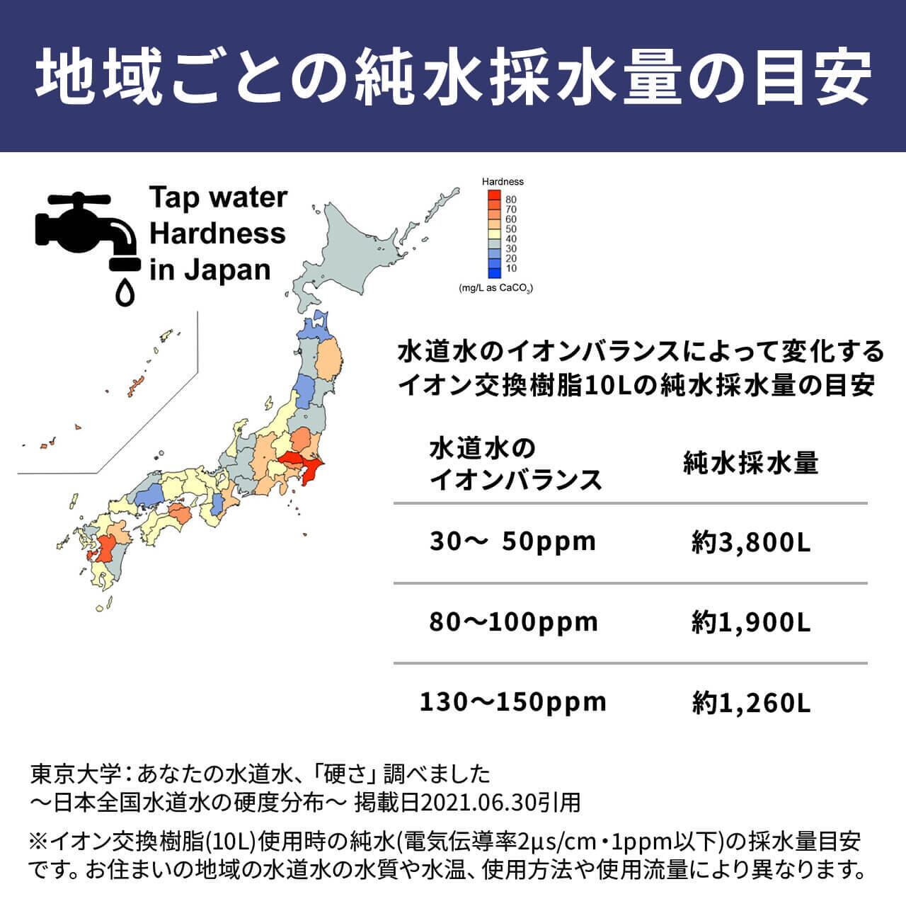イオン交換樹脂10Lの純水採水量の目安は、イオンバランス(ph値)が30~50ppmの水道水の場合、約3800Lです。