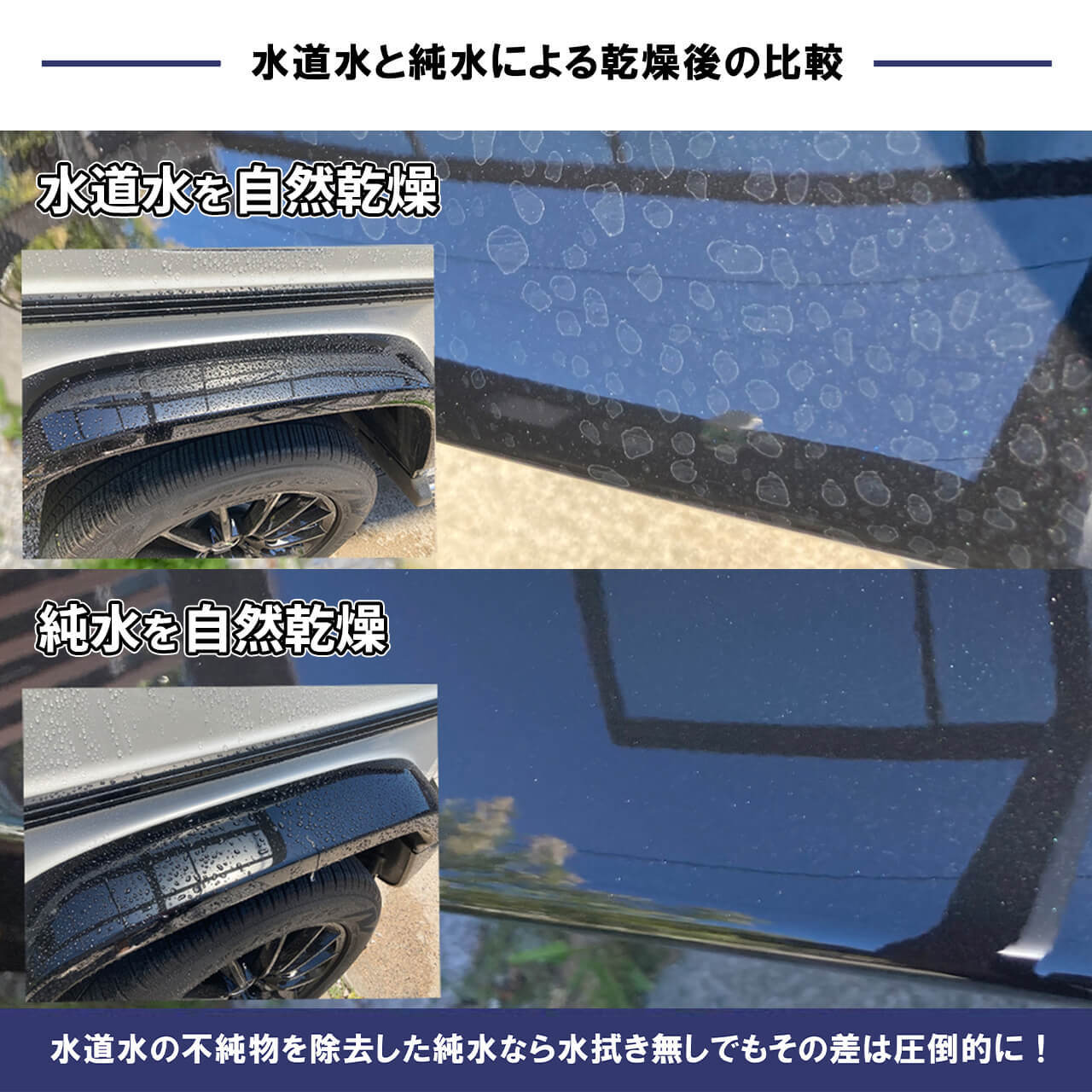 純水洗車の場合、この比較画像のように、拭き上げなしでもほとんど水滴の跡が残りません。