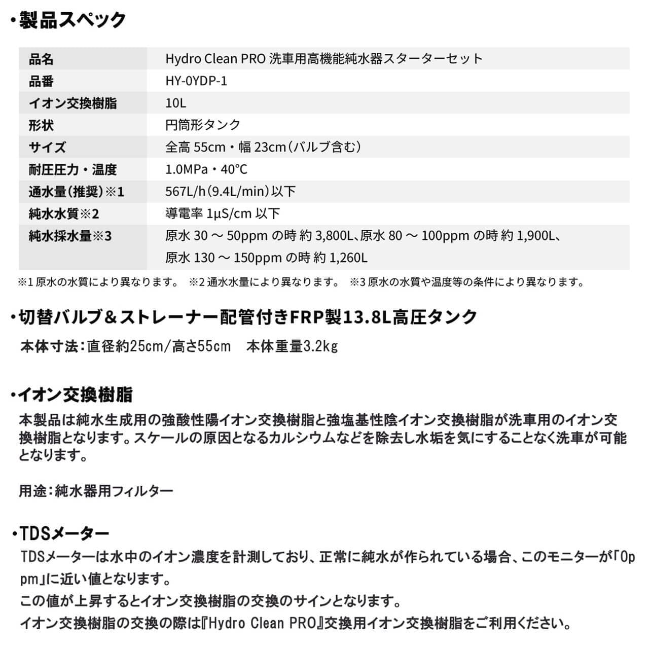 品名: Hydro Clean PRO 洗車用高機能純水器スターターセット / 品番: HY-0YDP-1 / イオン交換樹脂: 10L / 形状: 円筒形タンク / サイズ: 全高55cm・幅23cm(バルブ含む) / 耐圧圧力・温度: 1.0MPa・40℃ / 推奨通水量: 567L/h(9.4L/min)以下(※1) / 純水水質: 導電率1μS/cm以下(※2) / 純水採水量: 原水30~50ppmの時 約3,800L・原水80~100ppmの時 約1,900L・原水130~150ppmの時 約1,260L(※3)