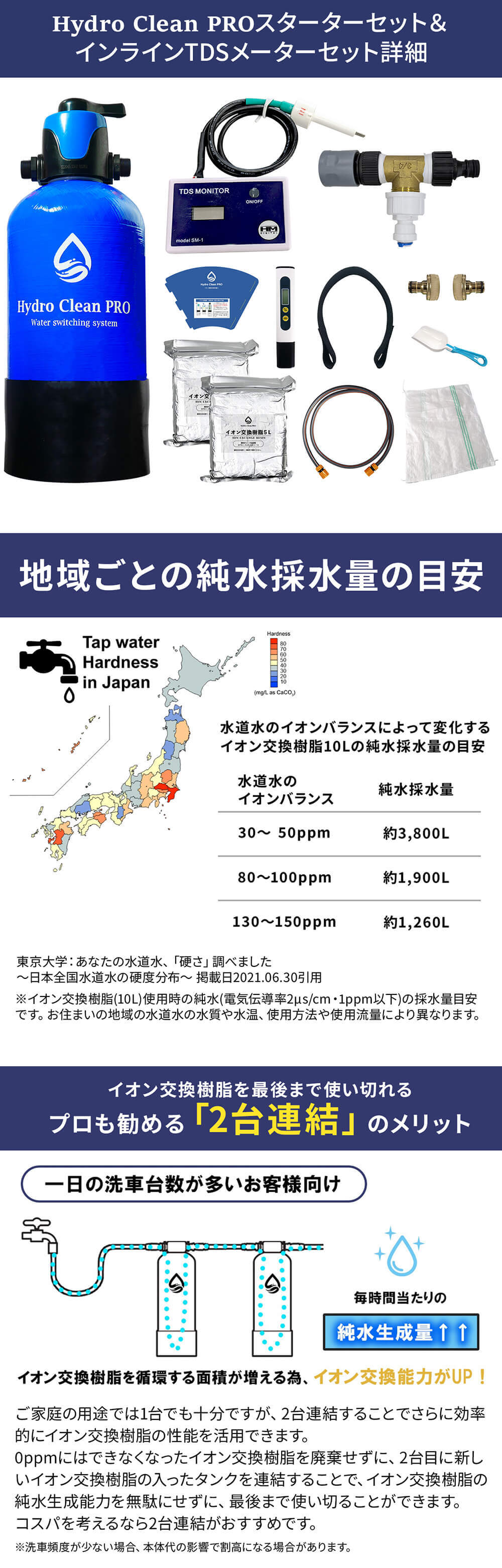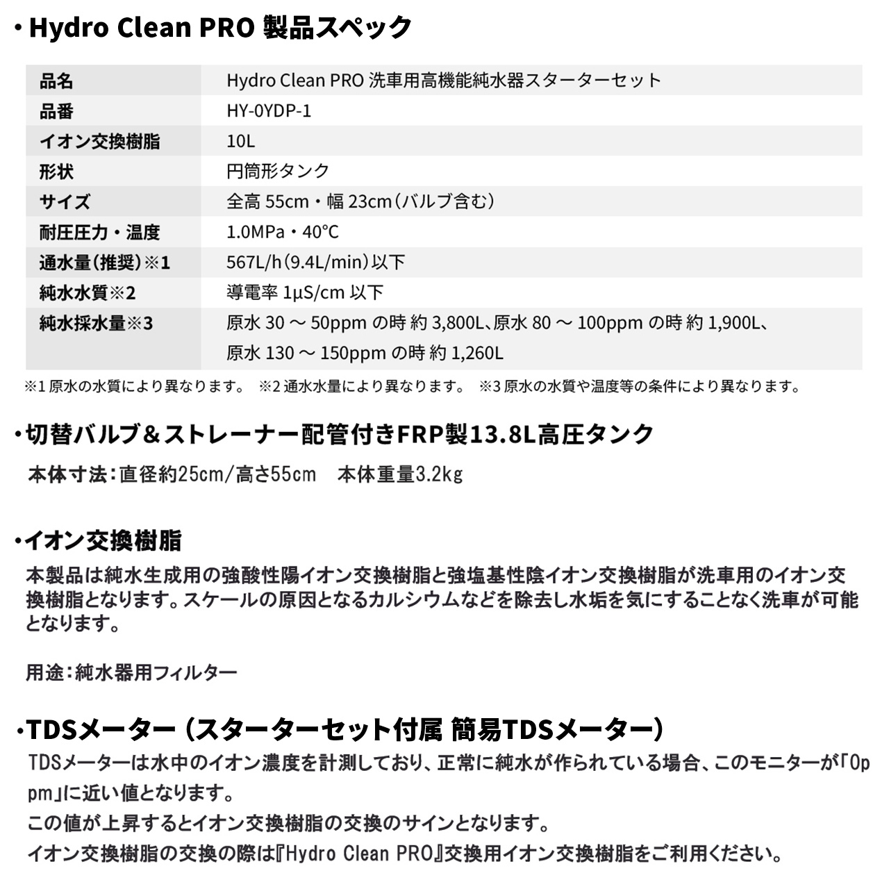 品名: Hydro Clean PRO 洗車用高機能純水器スターターセット / 品番: HY-0YDP-1 / イオン交換樹脂: 10L / 形状: 円筒形タンク / サイズ: 全高55cm・幅23cm(バルブ含む) / 耐圧圧力・温度: 1.0MPa・40℃ / 推奨通水量: 567L/h(9.4L/min)以下(※1) / 純水水質: 導電率1μS/cm以下(※2) / 純水採水量: 原水30~50ppmの時 約3,800L・原水80~100ppmの時 約1,900L・原水130~150ppmの時 約1,260L(※3)