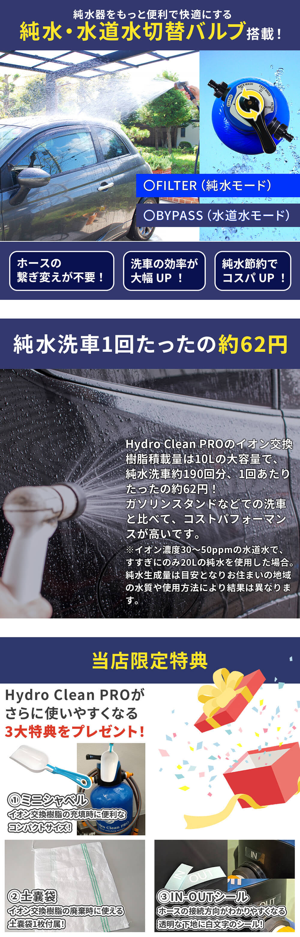 Hydro Clean PRO(ハイドロクリーンプロ)は、洗車中に「純水」と「水道水」を簡単に切り替えられる「モード変更バルブ」を搭載した、業務用にも活用されている高機能純水器です。
