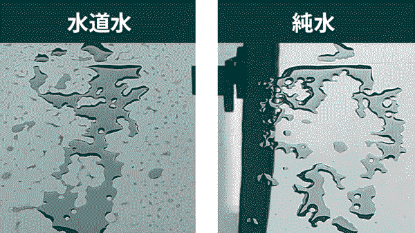 ミネラル分を除去した純水なら、イオンデポジット(水垢)が残りにくく、手間と時間の掛かる拭き上げ時間の短縮が可能です。