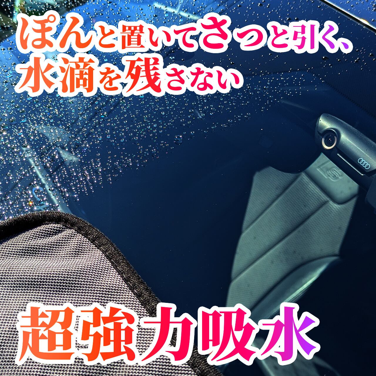 濡れたボディ面に広げて、手前の端を持って引っ張るだけでボディについた水滴を簡単に吸い取ってくれます。