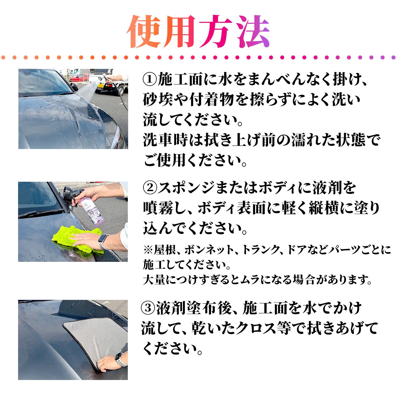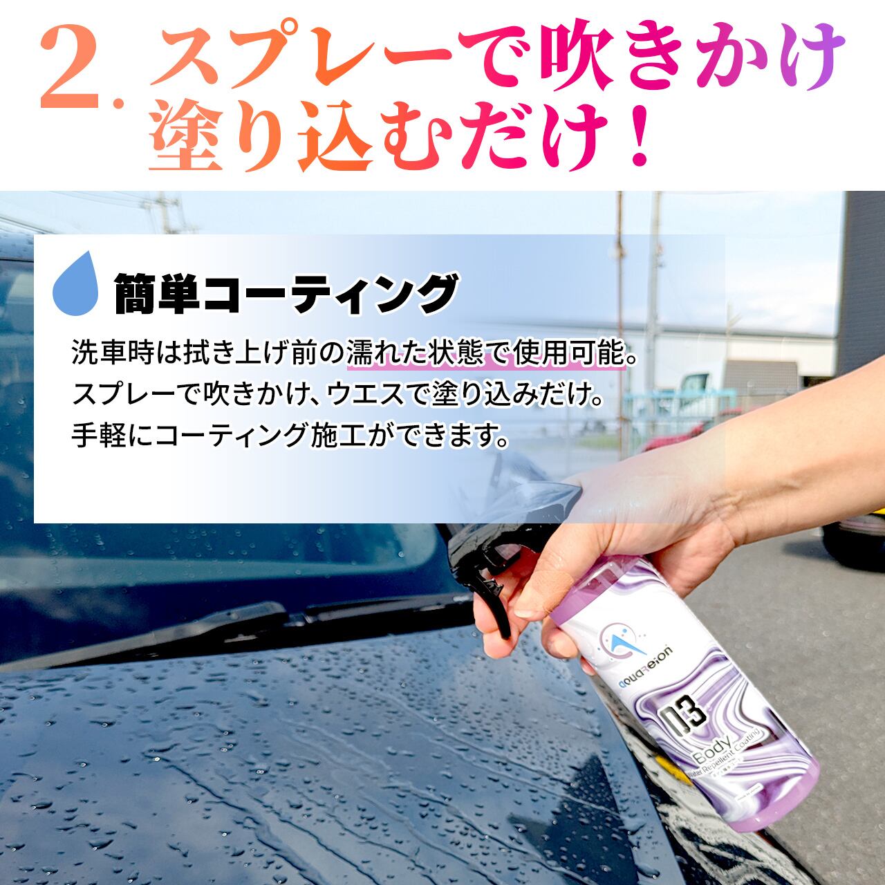 ・洗車後の濡れたボディに吹き付け、スポンジなどで馴染ませて水で流すことによりボディをガラス系の強い被膜でコーティングすることが可能です。